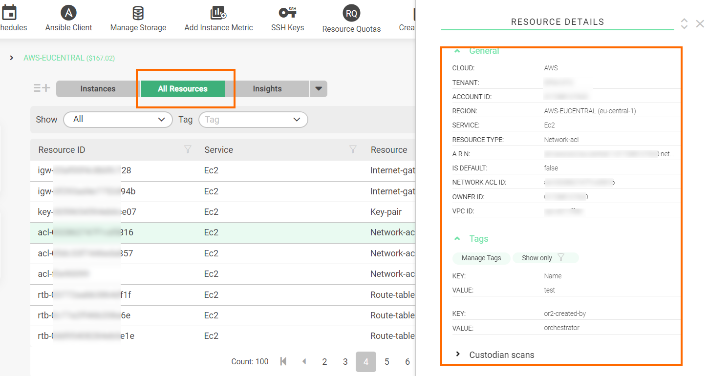 By clicking a specific resource you can not only see its detailed information, but also perform basic actions such as manage tags or assess the resource security.